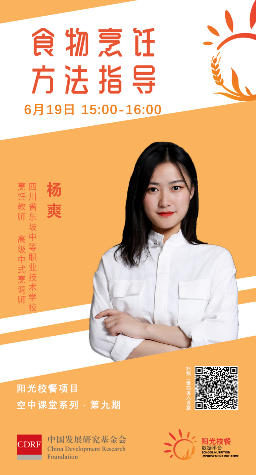 6月19日下午,阳光校餐项目组与赢未来计划项目组合作,邀请赢未来计划项目校四川省东坡中等职业技术学校烹饪教师杨爽老师带来了线上系列培训的第九讲。来自项目县的3000余名教育局负责人、学校校餐负责人、学校厨师和食堂工勤人员共同观看杨爽老师以“食物烹饪方法指导”为主题的直播课程。